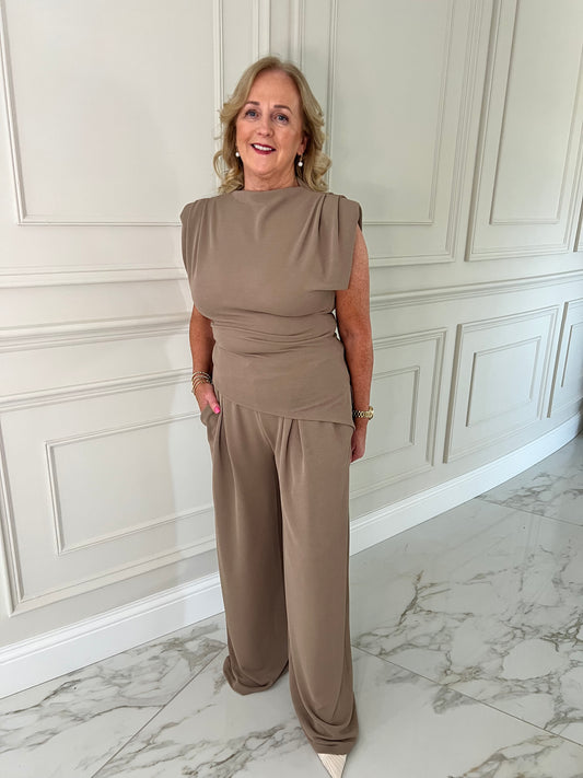 Nicole Taupe Asymmetric Top And Wide Leg Tousers Co-Ord