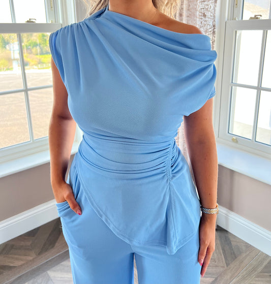 Rae Asymmetric Blue Ruched Top And Pleat Trouser Co-Ord