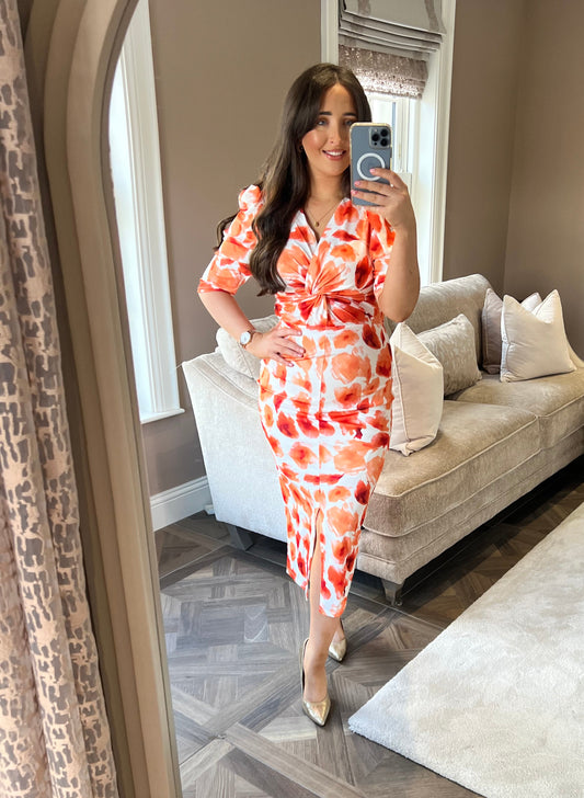 Olivia Pink And Orange Smudge Print Flutter Sleeve Wrap Midi Dress