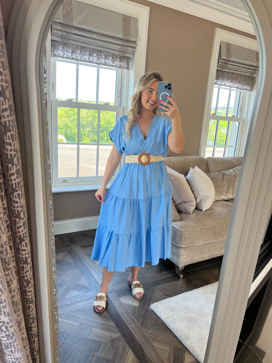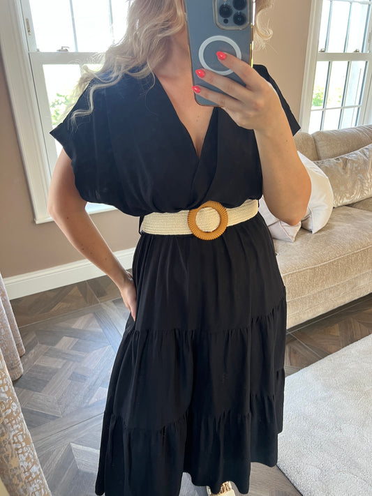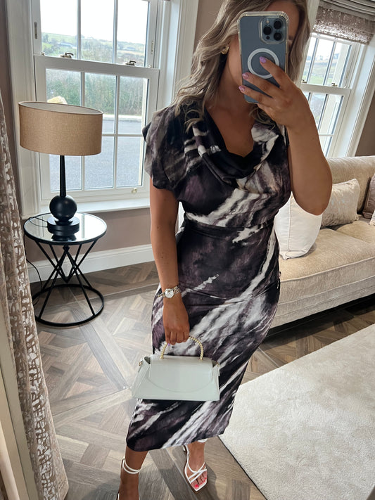 Grace Navy And Cream Abstract Print 3/4 Sleeve Tie Waist Shirt Midi Dress