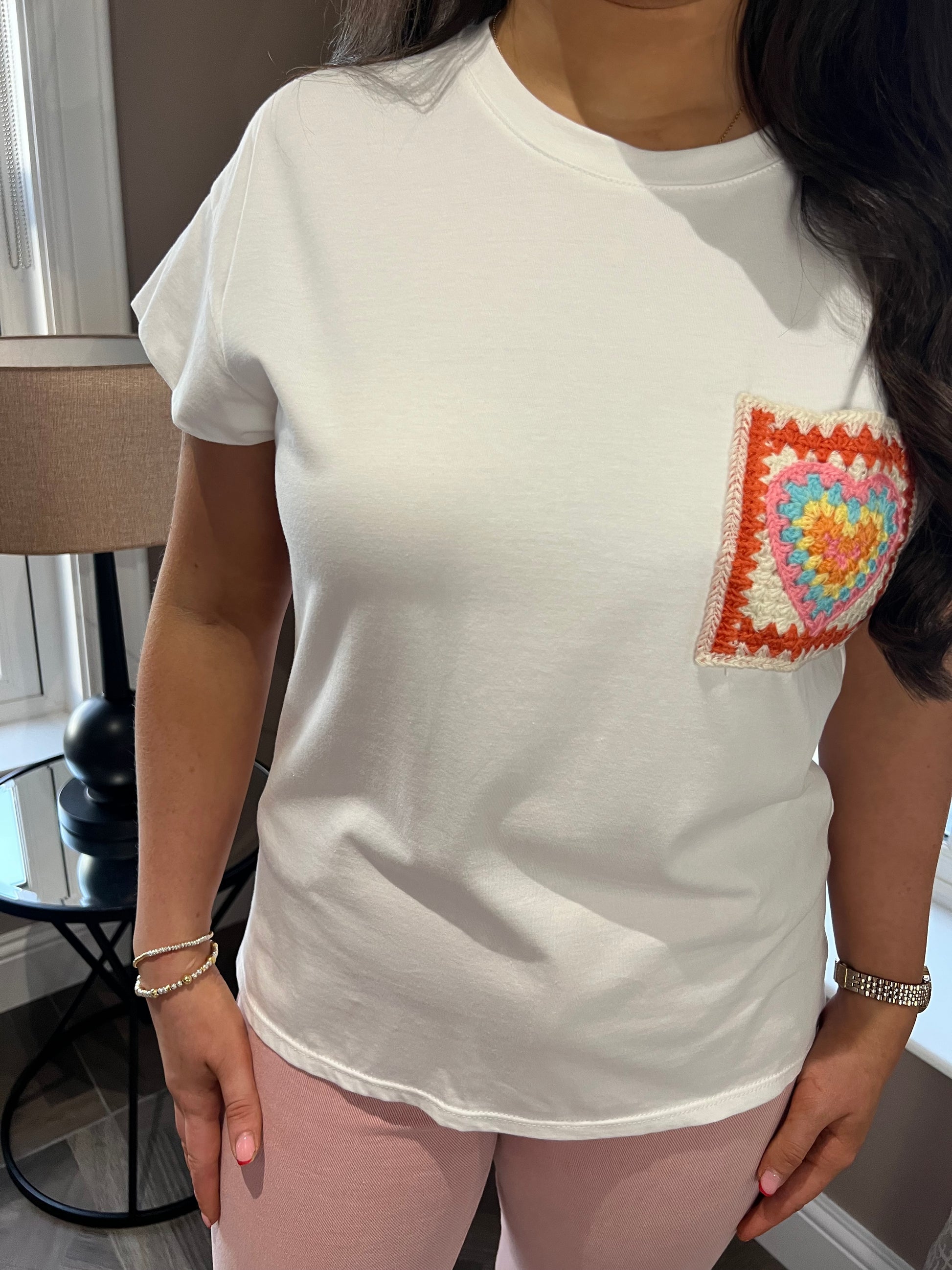 This white t-shirt features a unique crochet heart front pocket, adding a touch of texture to your wardrobe. Designed in one size, it offers versatility and effortless style. Made with high-quality materials, this t-shirt is both durable and comfortable, Upgrade your everyday look with this detailed white t-shirt.